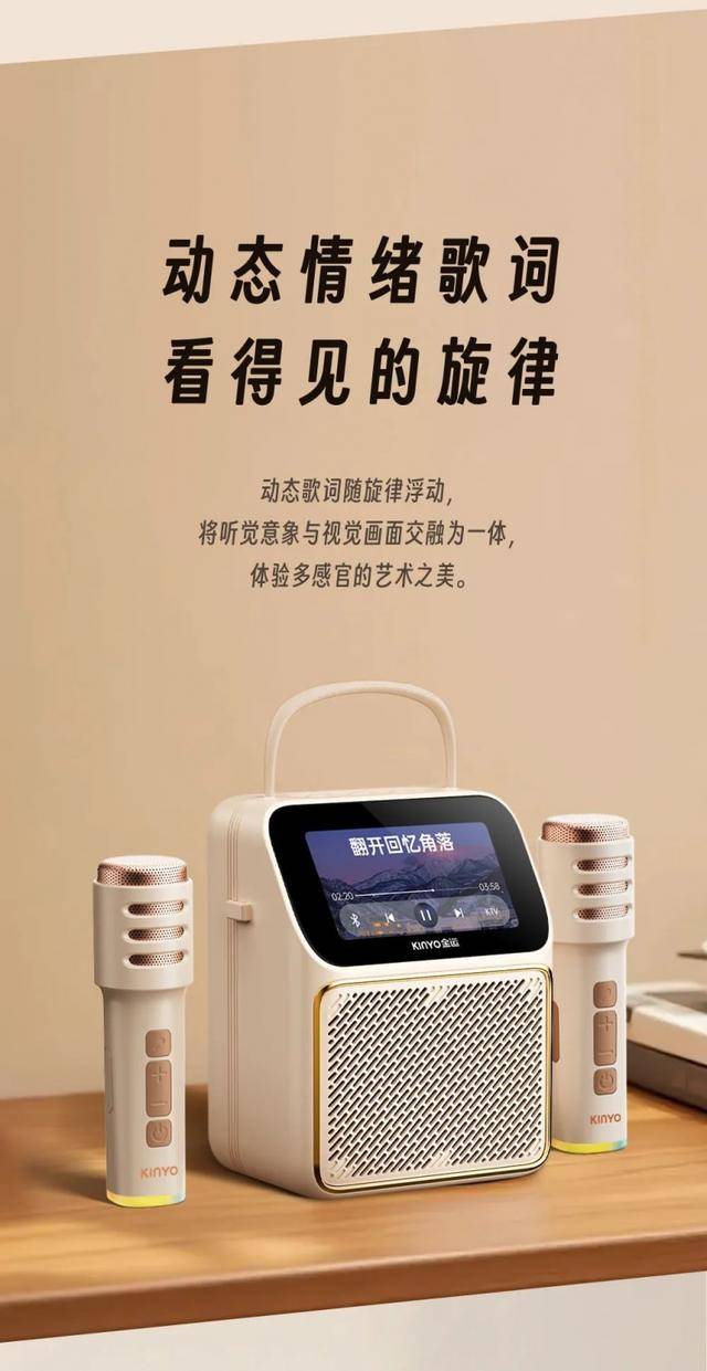 与此同时,金运并未忽视不同年龄层的需求。针对中老年群体,品牌打造了集“音响+麦克风+声卡”于一体的手持式K歌音响,从早期的金运手持K歌音响 H9 到迭代后的 H100,不仅音质大幅度提升,还优化了操作逻辑,更加易用,帮助老年人群轻松享受音乐与K歌的乐趣。