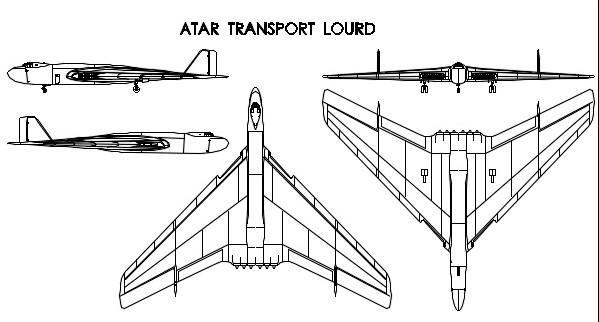 作为远程大型飞机的例子,ATAR设计了一种具有370平方米翼面积的飞翼,配备四台ATAR 103发动机。气动布局沿用这个飞翼系列,发动机埋入翼根后缘,配有一个排气口,但在设计改动为低延伸时会被取消。多个发动机并排排列在尾部分上造成了气流流动方面的问题,为了解决这些问题,尾喷口被前置在翼根。