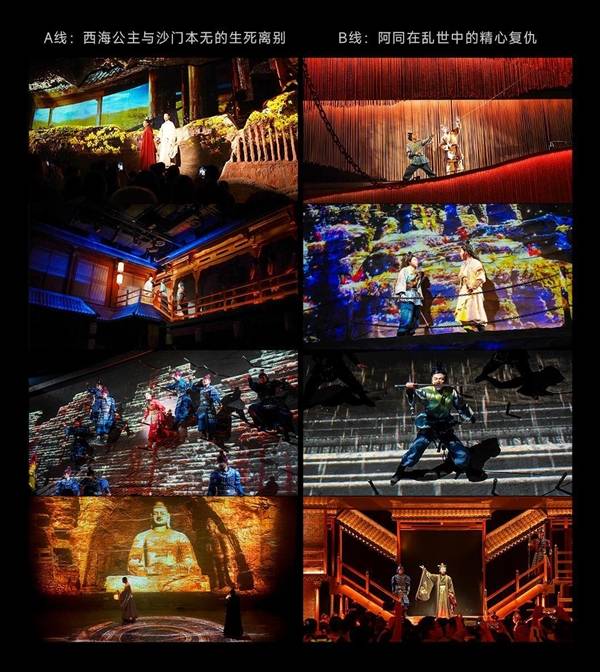 《如梦大同》聚焦本无、阿同两位小人物,编织了两段叙事线索。光影助力场景打造,两段故事从不同起点展开叙述,观众可自主选择其中一段故事,以剧中人的身份沉浸体验,最终汇聚在同一场景,共同见证一场传承千年文明的双向奔赴。